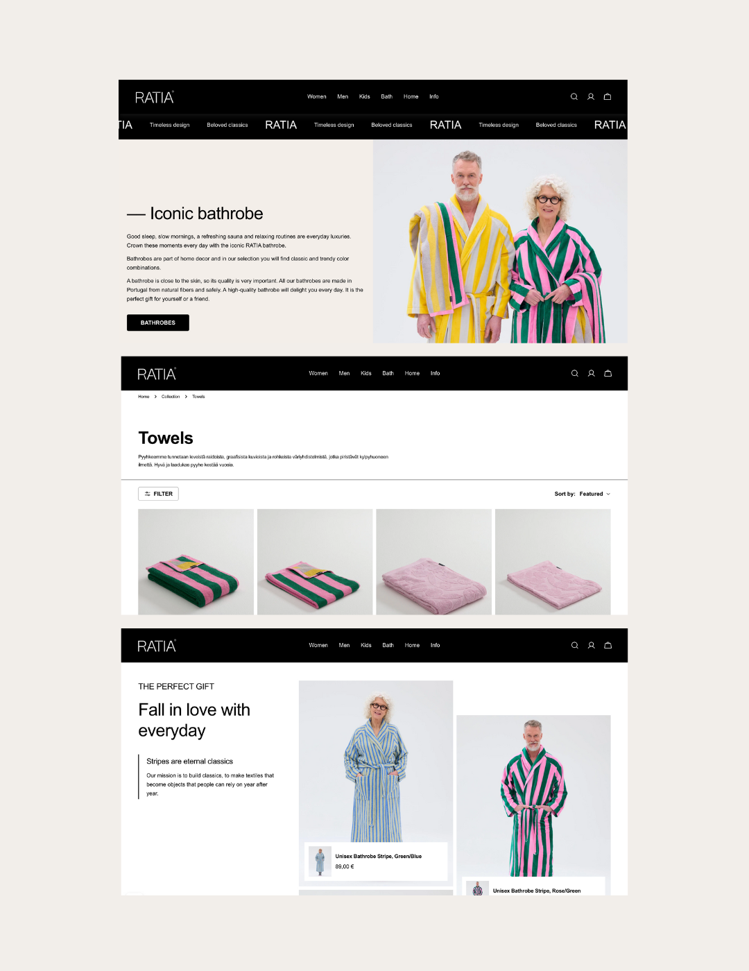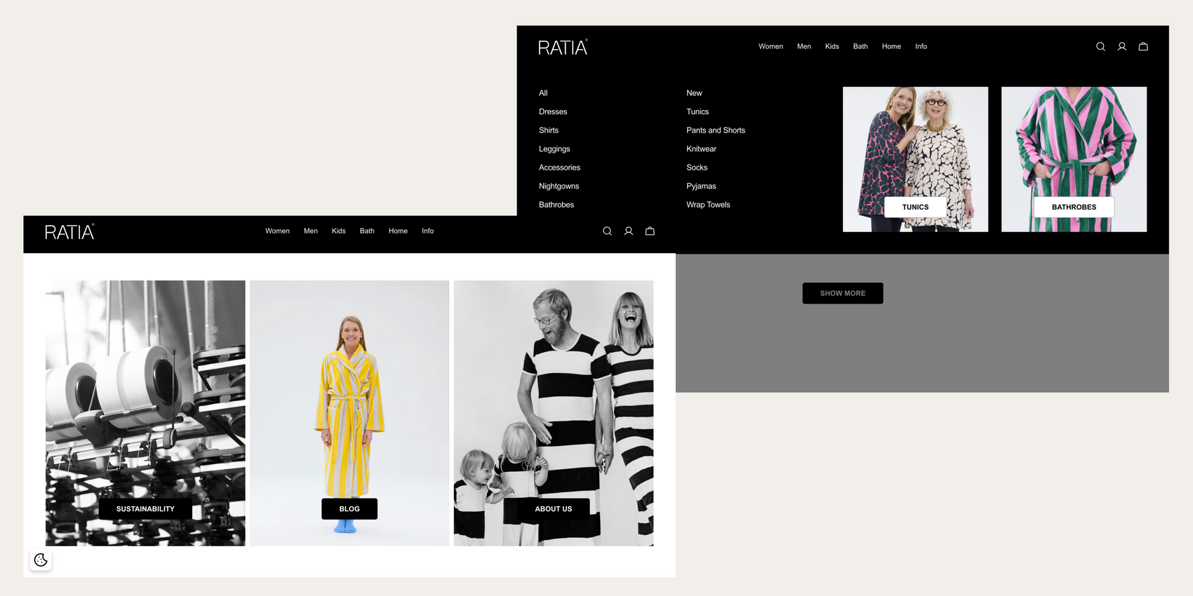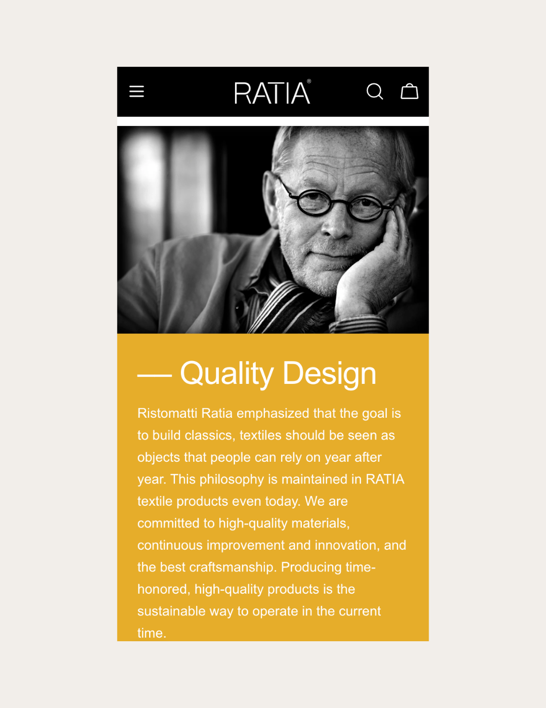 RATIA on suomalainen designbrändi, jonka juuret ulottuvat vuoteen 1999, jolloin Ristomatti Ratia perusti sen osaksi Blackmoda Oy:tä. Tunnettu ajattomasta muotokielestään, RATIA tuo arkeen kauneutta ja käytännöllisyyttä – aina kodintekstiileistä vaatteisiin ja asusteisiin. Yhteistyö kotimaisten ja kansainvälisten brändien kanssa on tuonut RATIA-tuotteet osaksi monen suomalaisen arkea.