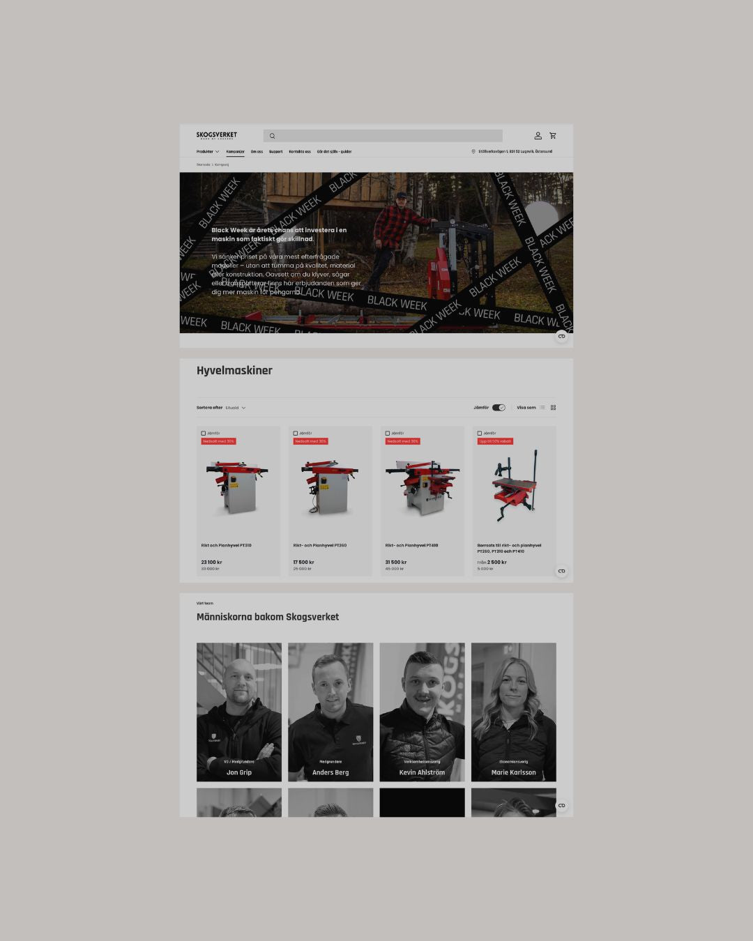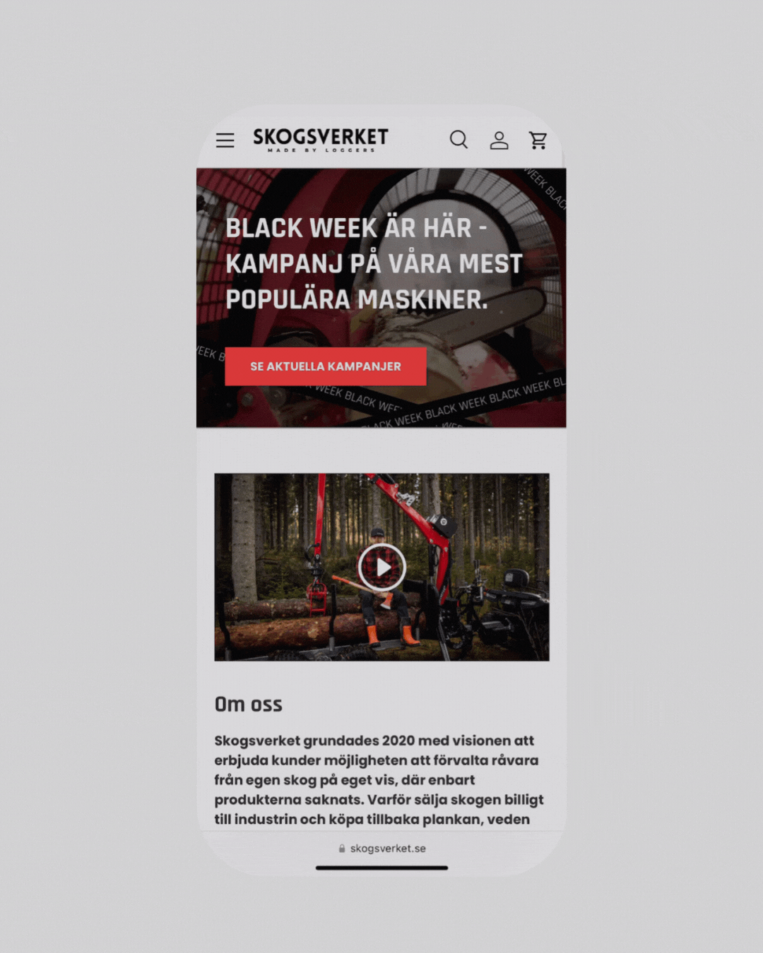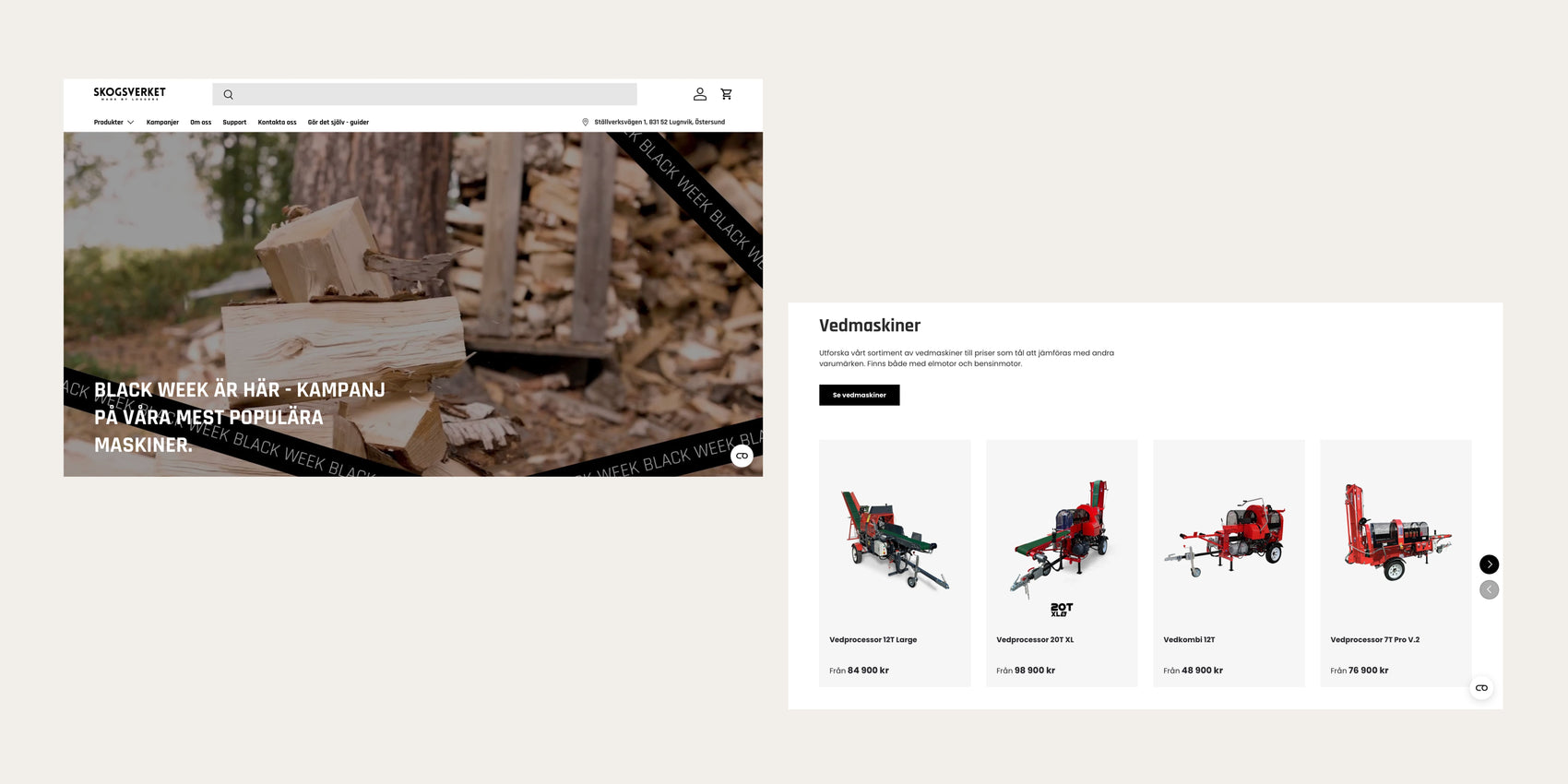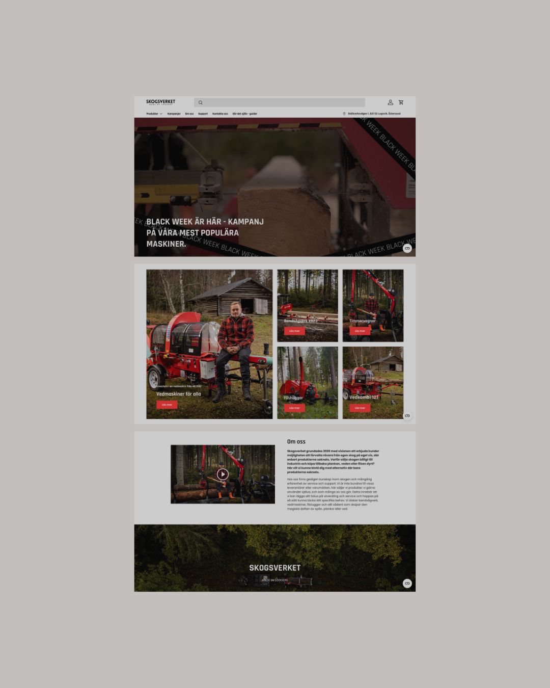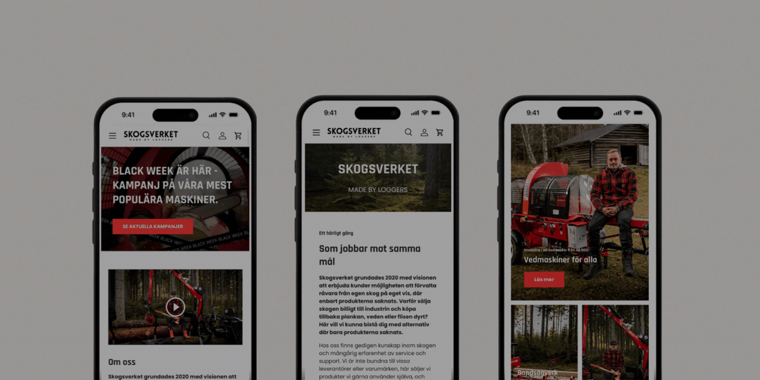 Skogsverket on ruotsalainen konevalmistaja, joka tunnetaan suorituskykyisistä koneistaan, jotka on rakennettu ammattilaisten arkeen ja kovaan käyttöön. Skogsverket valmistaa ja myy koneita, jotka vaativat tarkkaa tietoa ja selkeää ostopolkua: sahakoneita, klapikoneita ja hakkureita. Tuotteet eivät ole impulssiostoja, vaan merkittäviä investointeja ja verkkokaupan täytyy tukea tätä päätöksentekoa. Ajan myötä heidän WooCommerce-kauppansa oli kuitenkin hidastunut ja monimutkaistunut. Erityisesti teknisten konekategorioiden sivut kuormittuivat raskaasta datasta, tuoterakenne oli hajonnut eri moottoriversioiden muodostamiin erillisiin tuotteisiin ja SEO oli jäänyt vuosien varrella jälkeen, monilta tuotteilta puuttuivat kokonaan meta-kuvaukset ja kuvaukset olivat epäyhtenäisiä. Lisäksi osaa koneista ei ollut tarkoitus ostaa suoraan, vaan niissä asiakkaat kaipasivat selkeää tarjouspyyntöpolkua, jota vanha alusta ei tukenut. Kokonaisuutena Skogsverketillä oli tuotevalikoima, joka myi hyvin, mutta verkkokauppa ei enää pystynyt tukemaan kasvua, teknisyyttä ja tulevaa skaalautumista.