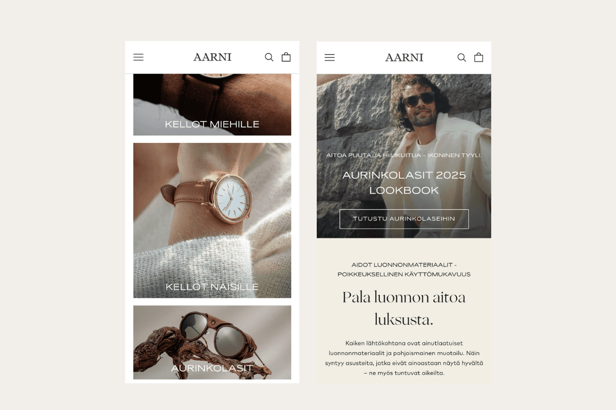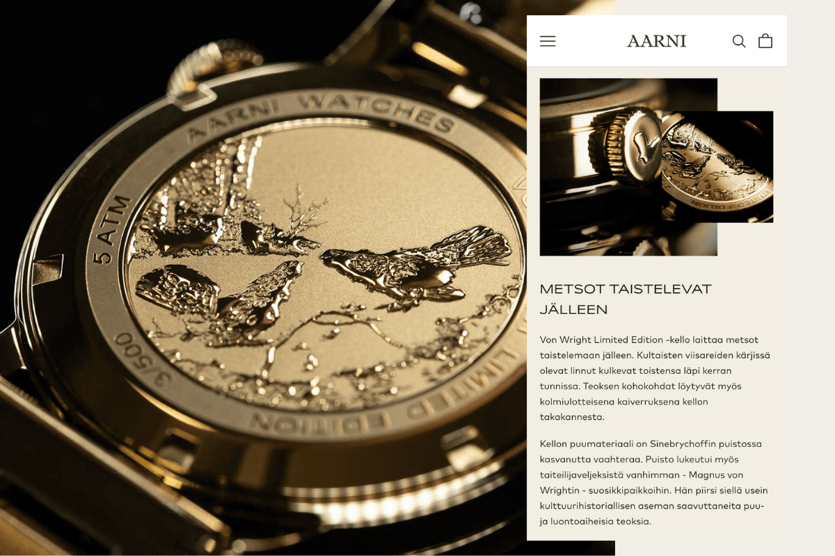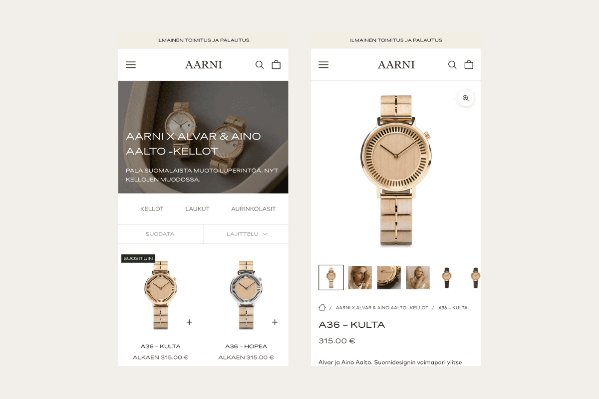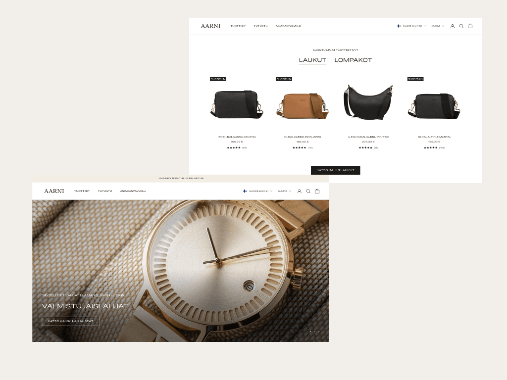 Aarni is a Finnish direct-to-consumer brand best known for its wooden watches and accessories, where Nordic design, natural materials, and sustainability form the core of the brand. From the beginning, Aarni has operated with an international mindset and a strong visual identity that sets high expectations for the online customer experience. As the brand grew, the need for a more scalable and future-proof commerce foundation became clear.